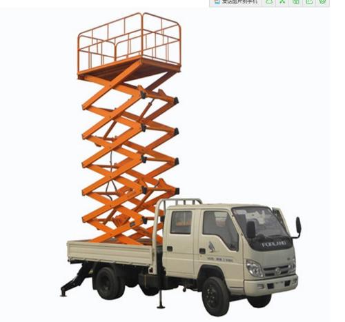 *車載式液壓升降平臺采用各種車底盤加固平臺底架,利用本車動力,在變速箱上輸出驅力油泵來操作。